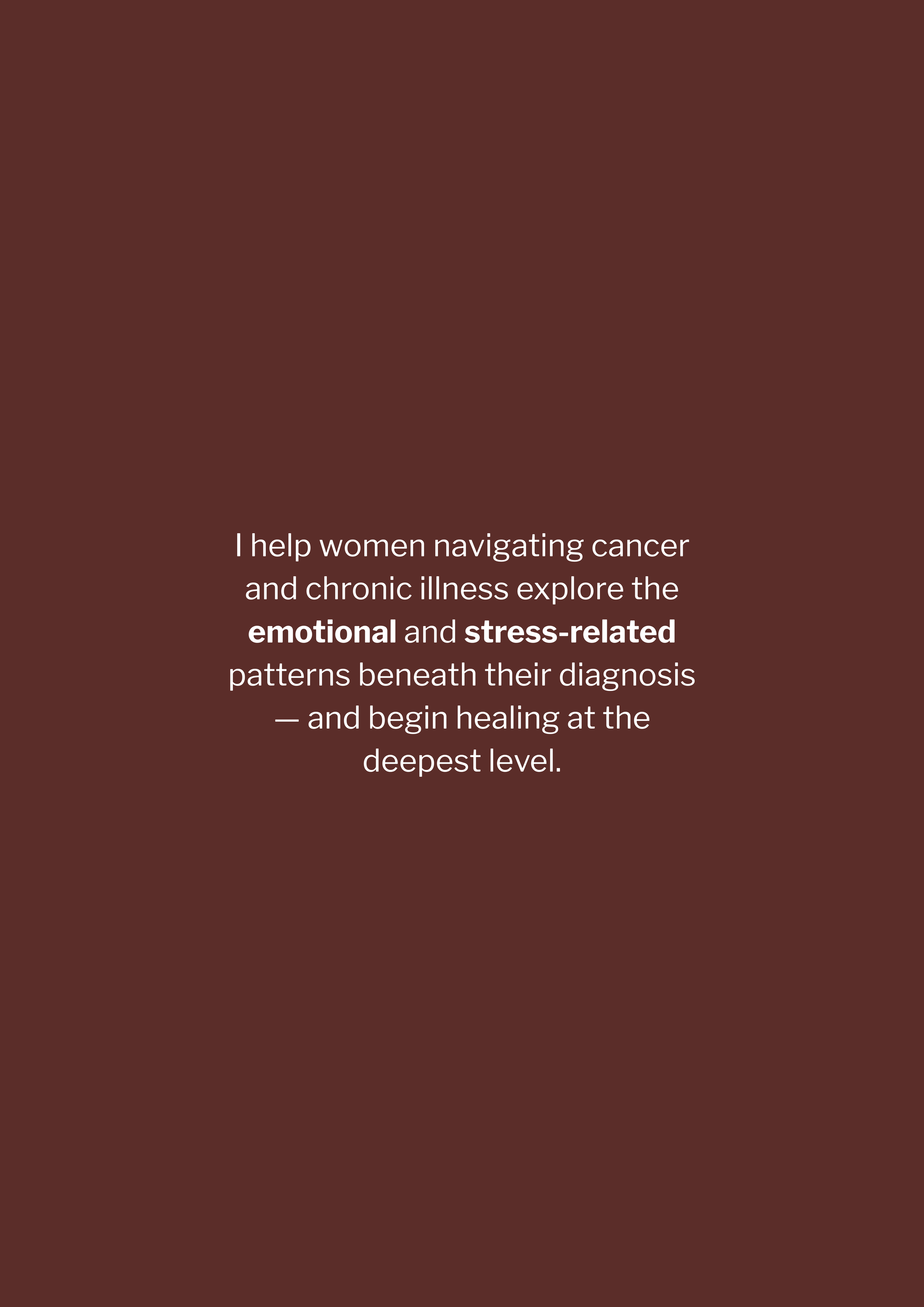 Today, I help women uncover the emotional drivers behind their illness and challenges, mapping a path toward resolution, transformation, and genuine healing. This isn't about managing symptoms—it's about dissolving the roots so you can finally be free.